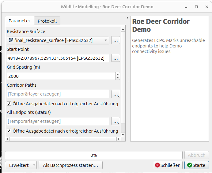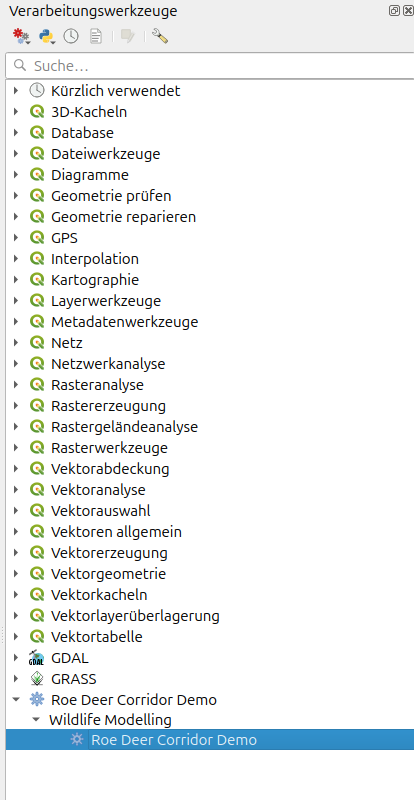 Das Plugin erscheint nun als Tool in der Seitenleiste (Processing tools) unter dem Menüpunkt Roe Deer Corridor Demo (siehe Abbildung 1). Allenfalls muss diese Seitenleiste noch aktiviert werden (Menüpunkt → ).