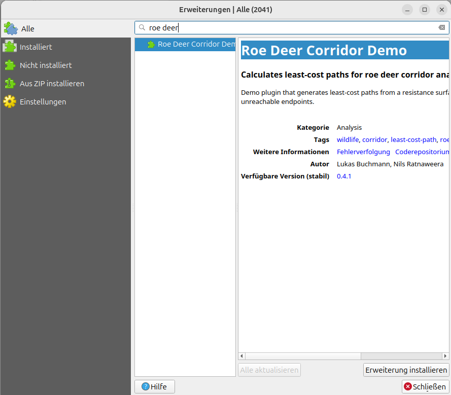 In der Suchleiste nach Roe Deer Corridor Demo suchen und beim entsprechenden Plugin auf klicken (s. Abbildung 3)