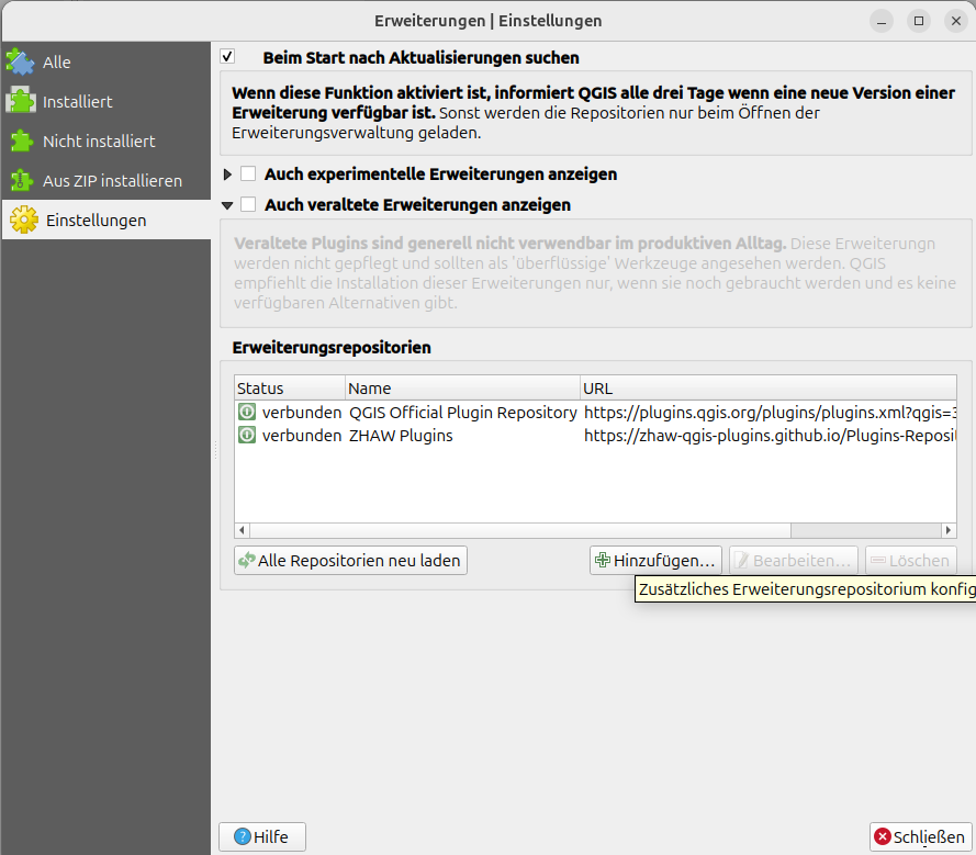 - Den URL vom ZHAW-eigenen Plugins Repositorium hinzufügen (siehe Abbildung 2) und mit bestätigen